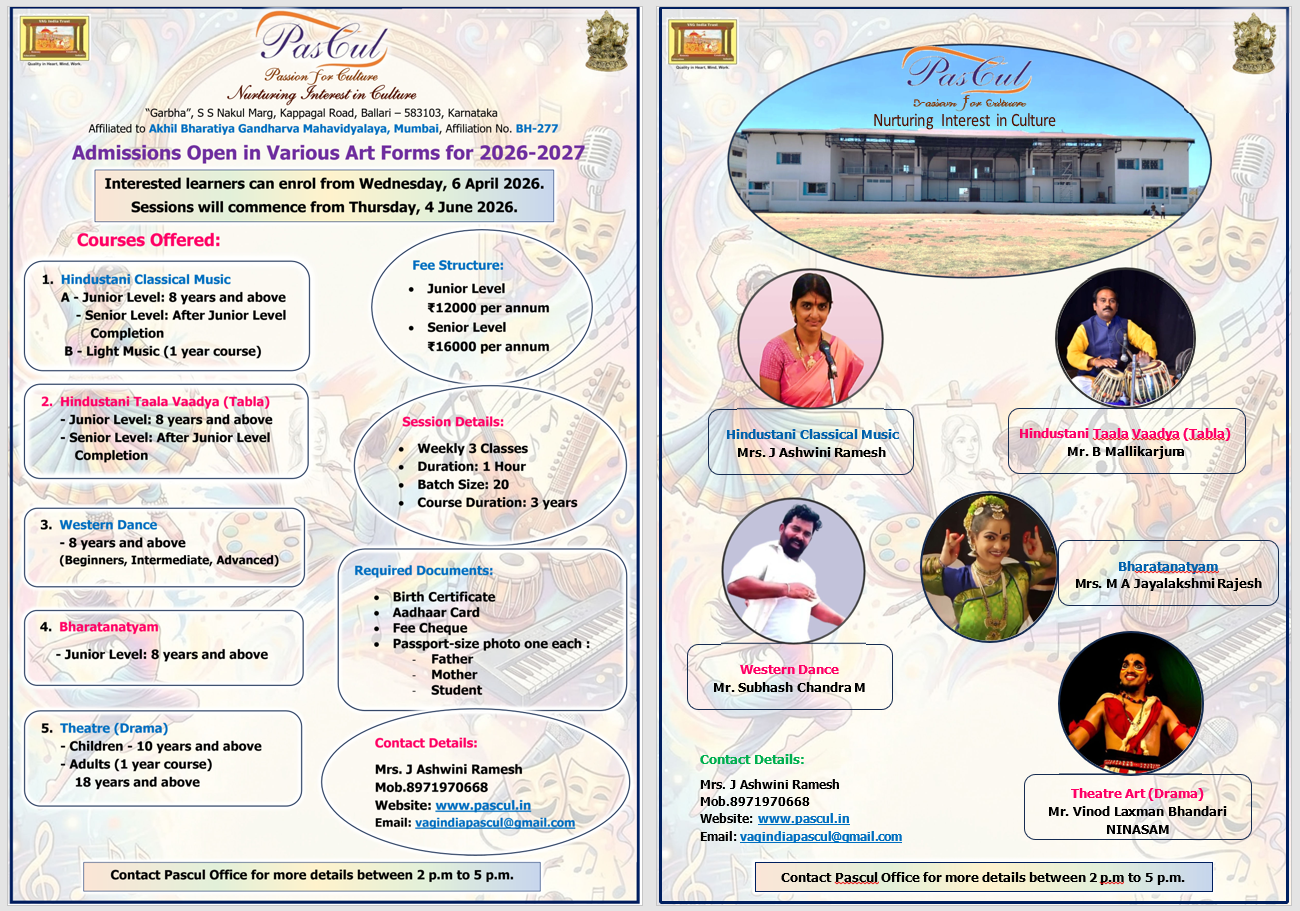 IMPORTANT NOTICE Admissions Open in Various Art Forms for 2026-2027